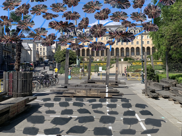 Cette installation a été imaginée pour répondre à un besoin simple mais essentiel : créer des zones d’ombre dans des espaces urbains très ensoleillés, comme la place de l’Hôtel Pasteur à Rennes, tout en mettant en valeur les principes de réemploi et de design responsable.
