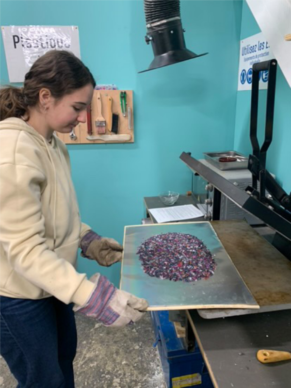 - Faites fondre dans une presse à chaud Precious Plastic jusqu’à obtention de plaques homogènes (épaisseur conseillée : 5 à 8 mm).