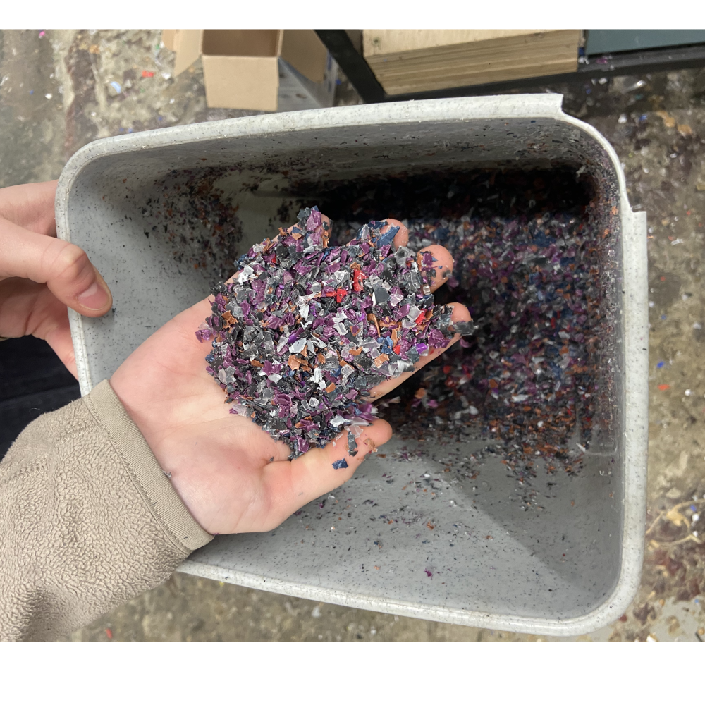- Utilisez un broyeur Precious Plastic pour les transformer en flocons de plastique.